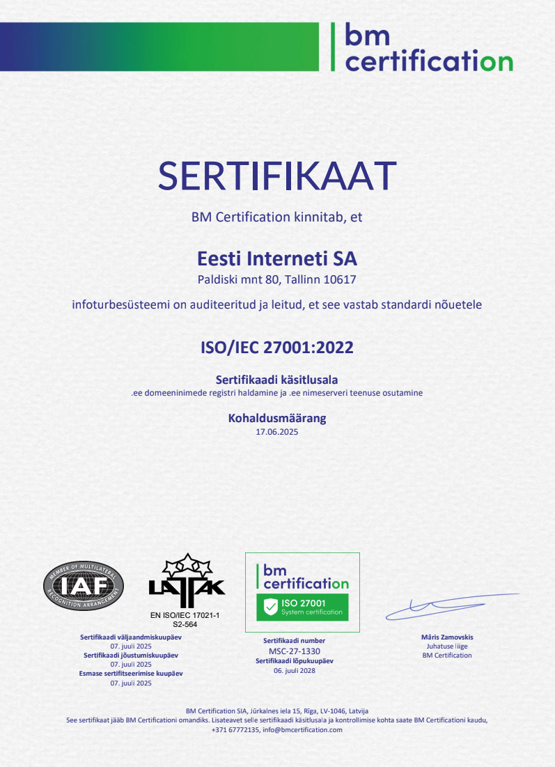 EISi jaoks elutähtsa üksusena oluline tagada kõrge infoturbe tase. Seda nii meie registreerijate kui registripidajate usalduse ja turvalisuse tagamiseks. Eesmärgi saavutamiseks oleme viinud enda teenuste infoturbe kooskõlla ISO/EIC 27001:2022 sertifikaadi standardiga. Sertifikaadi käsitluse alla kuuluvad .ee domeeninimede registri haldamine ja .ee nimeserveri teenuse osutamine.